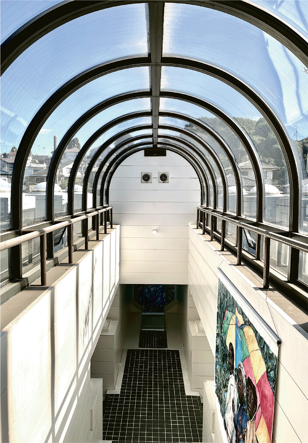 到頂端平台俯瞰,弧形桁架屋頂、浮游量體、錯置量體與人群、光與風也變化其中。原廣司的設計模糊了室內外界線,體現「有孔理論」、「樣相論」等,開孔接續着自然,也接續着人與空間,複雜多樣的空間隨着自然變化呈現着不同表情。