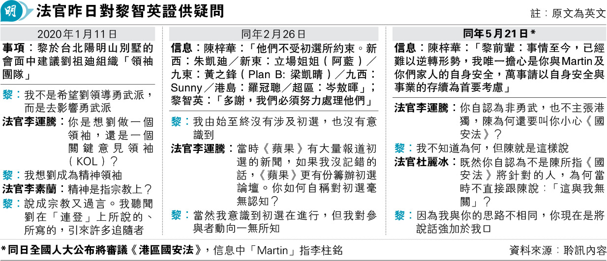 3名主審法官就上述信息向黎發問。法官李運騰提出,既然黎不是勇武人士或港獨分子,為何陳梓華覺得黎需要保持謹慎?黎說不知道。法官李素蘭追問,黎是否陳所指煽惑群眾的人?黎稱沒考慮這一點,自言「不太重視他(陳)的說話」。