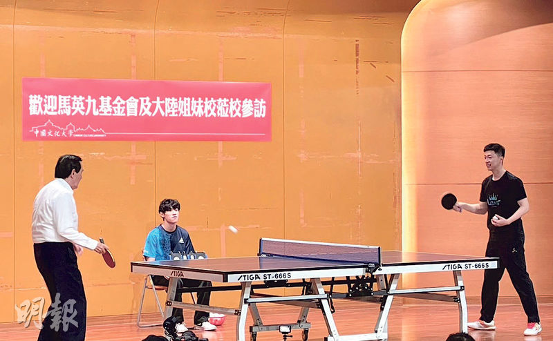 【明報專訊】馬英九基金會邀請的大陸高校師生訪台團,昨下午造訪中國文化大學,奧運乒乓球6金得主馬龍下場秀球技,與馬英九、台灣的奧運男女乒乓球手蔣澎龍和陳思羽切磋。