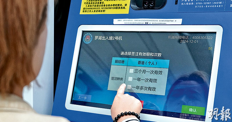本報記者昨午12時許在可辦理「一簽多行」簽注的「深圳市羅湖區政務服務中心」觀察,由於中心周日休息,內地居民只能使用自助機辦理手續;截至下午1時半,至少20名內地居民到場辦理一簽多行。申請者可選擇3類簽注有效期,包括3個月一次、一年一次,以及一年多次(一簽多行),收費80元人民幣。由核對資料、容貌到取得簽注,過程不用5分鐘。