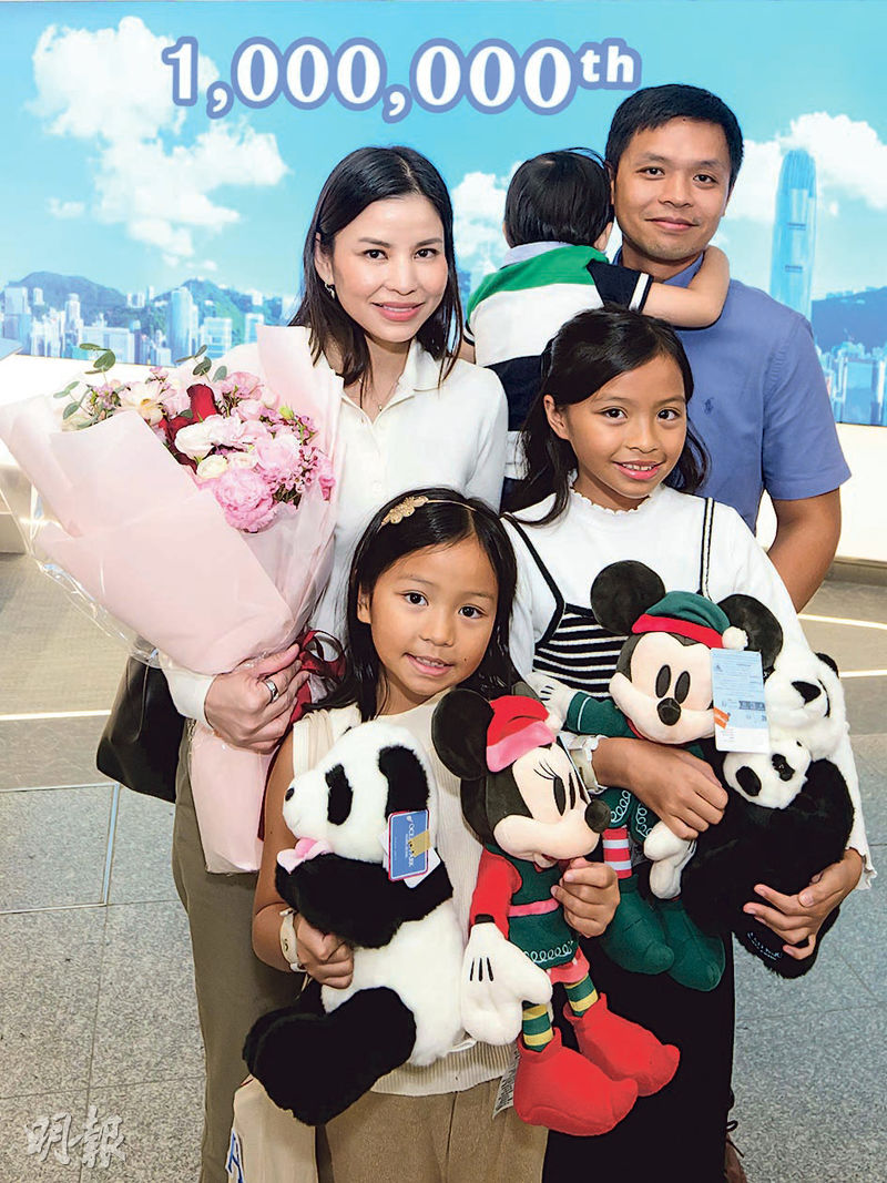 今年第100萬名菲國旅客是五口家庭,旅客Miguel Linao說,這次訪港主要是陪伴女兒參加在港舉辦的體操比賽,順道旅遊;菲律賓到香港僅需2.5小時航程,故過去也經常來港遊玩。