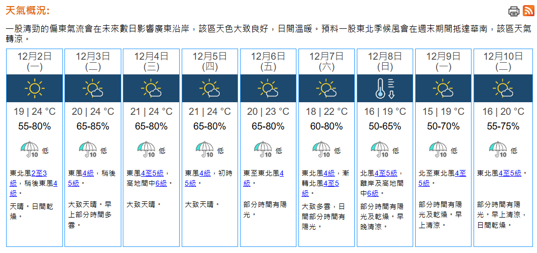 即時熱點 天氣|周一市區氣溫料19-24°C 天晴乾燥 轉吹東風 (19:30) 發佈於 12 個月 前 2024 年 12 月 1 日 By 明報 【19:30】本港地區今晚(12月1日)及明日(12月2日)天氣預測:天晴,明早市區最低氣溫約19°C,新界再低幾度。日間乾燥,最高氣溫約24°C。吹輕微至和緩東北風,明日稍後轉吹和緩東風。展望隨後數日大致天晴,日間溫暖。[8款潤燥湯水茶飲一文睇][皮膚保濕宜忌] 【10:05】天文台上午10時錄得氣溫19.9°C,相對濕度67%。本港地區今日(12月1日)天氣預測:天晴,日間乾燥。吹輕微至和緩東至東北風。展望未來兩三日大致天晴,日間乾燥,氣溫逐步回升。(天文台) 相關文章:天文台天氣天氣速遞編輯推介 Up Next 大棠紅葉2024|「紅葉情報」專頁每周更新大棠紅葉指數 紅葉節12月14日起逢周六周日公眾假期舉行 (14:37) 不要錯過 短片:624萬美元投得「牆上香蕉」 幣圈投資者孫宇晨當眾吃掉讚好吃 (14:50) 繼續閱讀 贊助商 猜你喜歡 天氣|天文台:周一早上市區氣溫料22°C 周四降至20°C (19:02) 天氣|天文台:今日乾燥部分時間有陽光 市區最高氣溫27°C (09:09) 天氣|天文台:日間最高28°C 吹和緩北至東北風 (09:31) 天氣|天文台:周日多雲日間乾燥 氣溫24至30°C (20:01) 短片:樺加沙一個月後 重災區將軍澳海濱未復常、富麗敦海洋公園酒店大門復修中 (08:59) 天文台:今日沿岸水位高0.5至1米 晚上漲潮部分沿岸低窪地區或輕微水浸 (08:35)