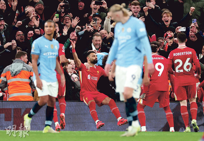 【明報專訊】穆罕默德沙拿昨在英超先助攻後射入12碼,帶領利物浦主場以2:0輕取曼城,賽後13戰得34分續高踞榜首,遙領隨後的阿仙奴及車路士9分。「藍月」賽後各賽事連續7仗不勝,主帥哥迪奧拿亦執教生涯首吞聯賽四連敗,並被「紅軍」球迷高唱「明早被炒」揶揄,惟他只能苦笑着疑似展出曾六奪英超的手勢回應。