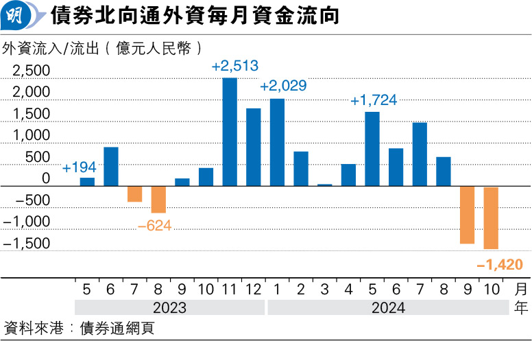 據債券通公司的數據顯示,境外機構持有內地銀行間債券的總值亦已連續兩個月下跌,由2024年8月的4.52萬億元,降至9月份的4.39萬億元,再進一步降至10月份的4.25萬億元。