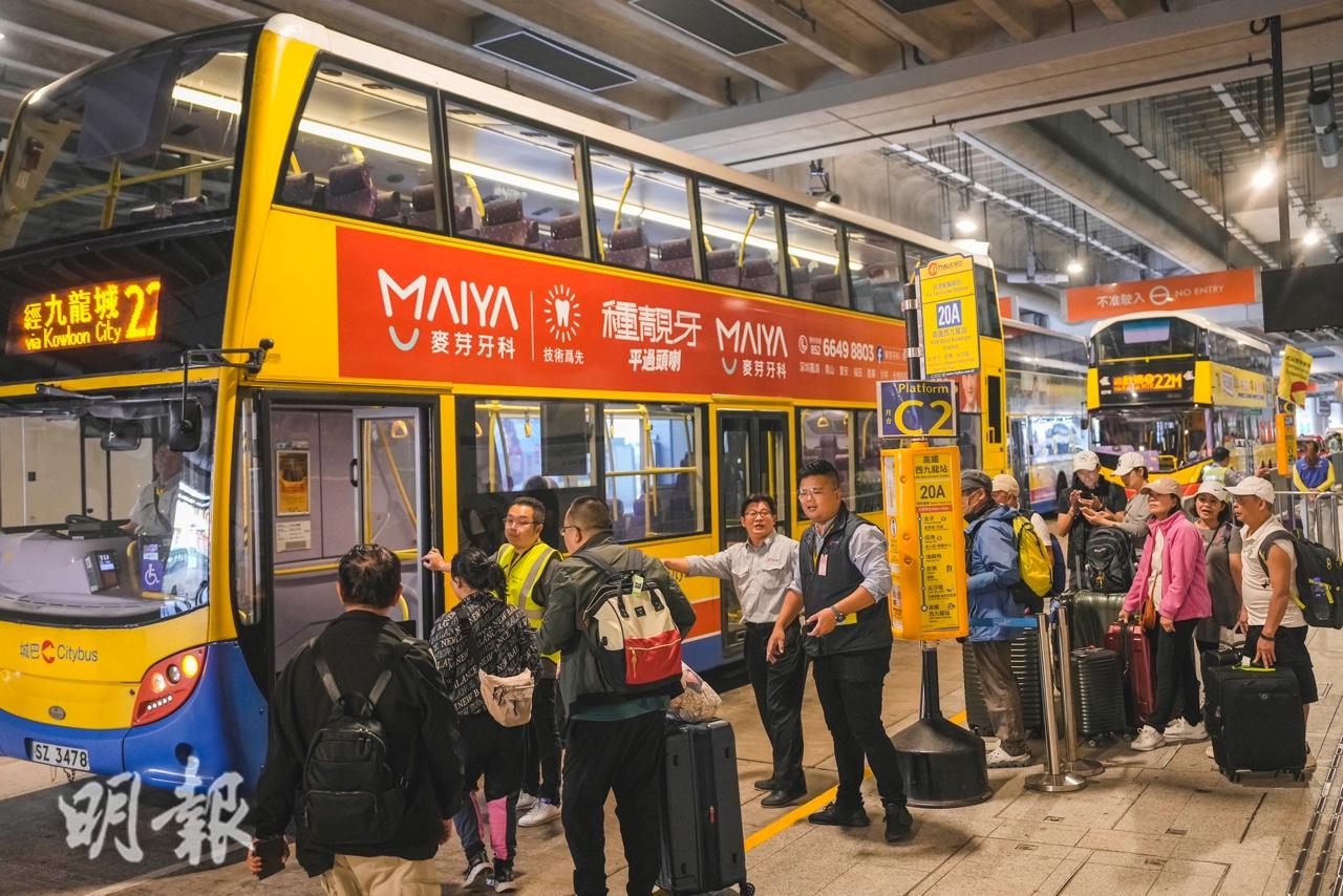 5條途經郵輪碼頭的巴士線均於早上5時許至7時許開始行駛。政府早前指,除四條常規巴士路線及一條專線小巴路線外,將額外增加兩條特快巴士路線,分別接駁啟德站和高鐵西九龍站,預計至少53個巴士班次投入服務;碼頭營運商將向進入碼頭載客的士派發100元石油氣優惠券。另繼續有收費及免費旅遊巴路線分別往觀塘APM商場,以及鑽石山、九龍塘及高鐵西九龍站,惟首班車於8時半或9時開出。