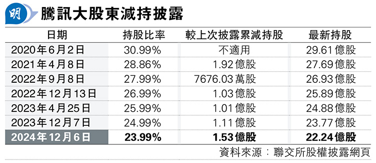 值得注意的是,此次披露已是自2021年4月以來,第五次披露減持騰訊跨越整數百分點(見表),距上次2023年12月7日相隔約一年,相對過去數次每隔數月減持超過1個百分點持股的速度較慢。但細看期間減持股數大增,可知並非因大股東「惜售」,而是由於騰訊近年積極回購股份,間接推高大股東的持股比例,令須披露的時間間隔拉長。今年以來,騰訊回購金額已超過900億元,回購註銷後減少已發行股本,令南非大股東持股比例相對提高,以至需時更久才減持跨越1個百分點。