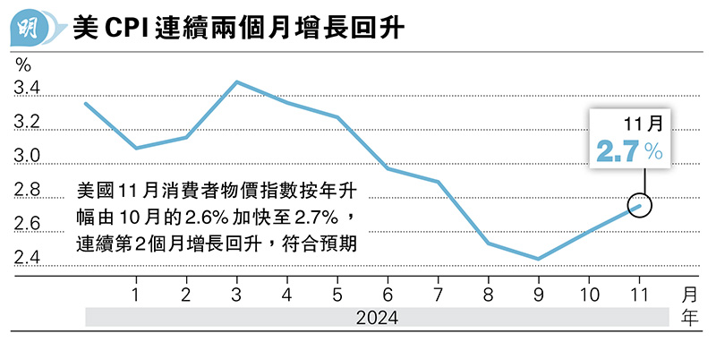 【明報專訊】美國通脹回落的進程陷於停滯,11月消費者物價指數(CPI)按月升0.3%,較7月至10月一直維持在0.2%的按月升幅有所加快,是7個月來最大的升幅,但符合市場預期。按年計算,11月CPI升幅由10月的2.6%加快至2.7%,連續兩個月通脹增長回升。