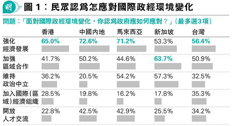 觀點 筆陣:環球動盪局勢下的亞洲民意走向/文:陳景祥 發佈於 11 個月 前 2024 年 12 月 18 日 By 明報 【明報文章】「2024亞洲五地趨勢調查:動盪局勢下的民意走向」於今年11月完成。調查由「遠見民意研究調查」統籌,並由香港浸會大學新聞與社會研究所、台灣《遠見》雜誌、新加坡《聯合早報》和馬來西亞《星洲日報》共同完成(註),希望了解五地民眾(香港、內地、馬來西亞、新加坡、台灣)在動盪局勢下的民意走向。 相關文章: Up Next 聞風筆動:中央視澳門「一國兩制」典範 成管治香港參考 /文:李先知 不要錯過 聞風筆動:俄羅斯尋求法律服務 「港仲」涉俄個案首入十大 /文:李先知 繼續閱讀 贊助商 猜你喜歡