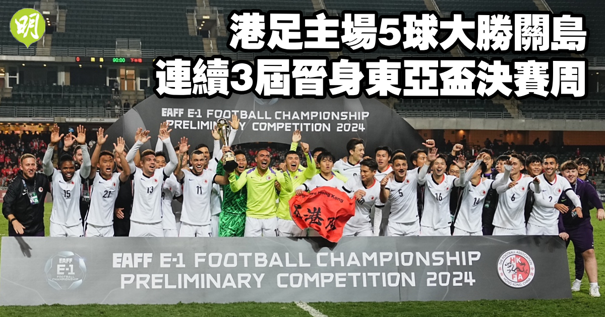 東亞盃外圍賽決賽今晚(17日)開戰,中國香港足球代表隊(港足)憑中場陳肇鈞梅開二度及翼鋒艾華頓助攻「帽子戲法」,以5:0大勝關島隊,在香港大球場有8236名觀眾入場見證下高舉東亞外獎盃,晉身預定7月在韓國舉行的決賽周,以及將連續3屆參賽,並首次在國際賽取六連勝。