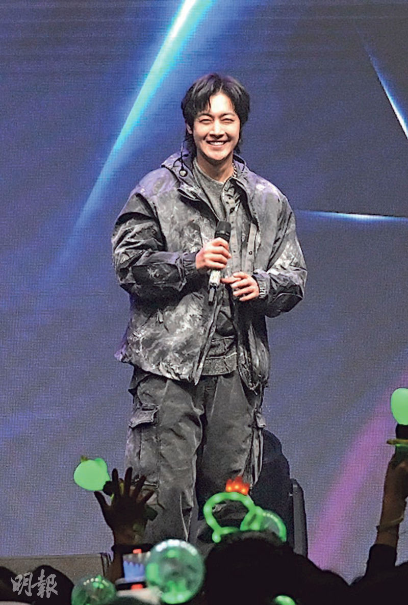 【明報專訊】《惡作劇之吻》38歲韓星金賢重前晚「冬至」在旺角麥花臣場館舉行演唱會,以快歌《Break Down》及《I’m a Million》揭開序幕,台下粉絲隨即站起來揮動手上應援燈,氣氛熱鬧。金賢重用廣東話打招呼說:「大家好,我係金賢重,好耐無見,好掛住你哋,我愛你哋。」他表示已12年沒來港演出,感謝香港粉絲一直等他,會唱12年來大家想聽的歌。