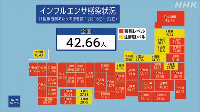 日本厚生勞動省昨公布,據全國約5000間定點醫療機構通報的流感患者,16至22日的一周(第51周)為211,049人,平均每間機構通報42.66人,比9日至15日的19.06人大增逾一倍,有36個都府縣超過了平均30人的「警報」基準。大分縣平均每間機構通報人數最高,達82.64;東京都則為40.02人。東京上次達「警報」級別為2019年1月。日本「國立感染症研究所」表示,該國最近5周內94%的流感個案均由「AH1pdm09」病毒誘發。