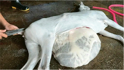 交易市場附近還有非法屠宰場,屠夫用刀在羊肚皮劃開,巨大的羊胃立即攤在地上;再一刀劃開羊胃,綠色草料噴湧而出。一些被灌食後死亡,或運輸途中死亡的山羊,也會被買手購入後送到此處屠宰。有買死羊的商販說,死羊的肉「會有些腐爛」,需要割掉。