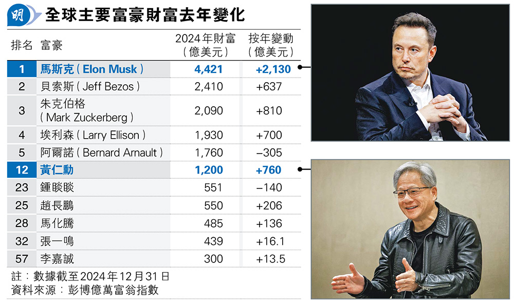 【明報專訊】彭博報道,2024年美國科技股表現強勢,帶動全球首500名富豪更富有,特斯拉(Tesla)(美:TSLA)創辦人馬斯克(Elon Musk)、Meta(美:META)行政總裁朱克伯格(Mark Zuckerberg)和Nvidia(英偉達)(美:NVDA)行政總裁黃仁勳去年財富均大幅增長(見表),帶領全球首500名富豪的淨資產總額突破10萬億美元大關(約78萬億港元),財富規模相當於德國、日本和澳洲2023年國內生產總值(GDP)總和。
