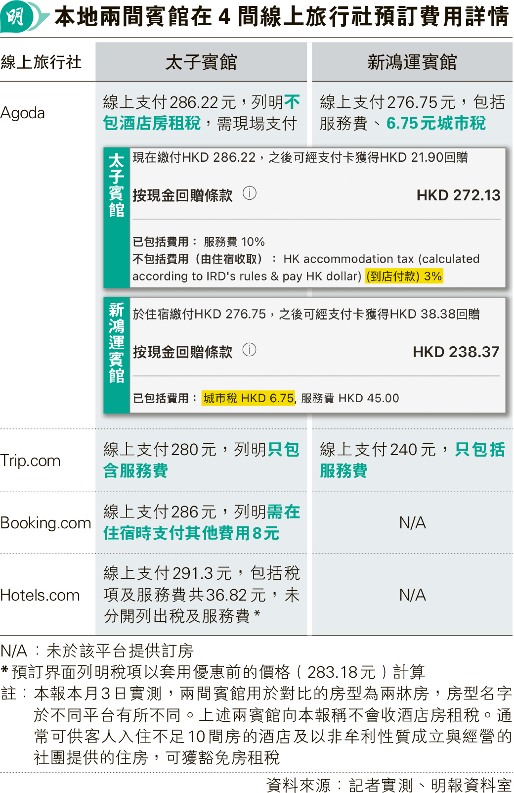 至於Booking.com和Hotels.com,預訂太子賓館皆列明需繳納稅項,表述則各不相同,前者列明需現場支付「其他費用」,後者稱線上支付費用包括稅項及服務費但未列出分項。新鴻運賓館則沒在該兩平台提供線上預訂。
