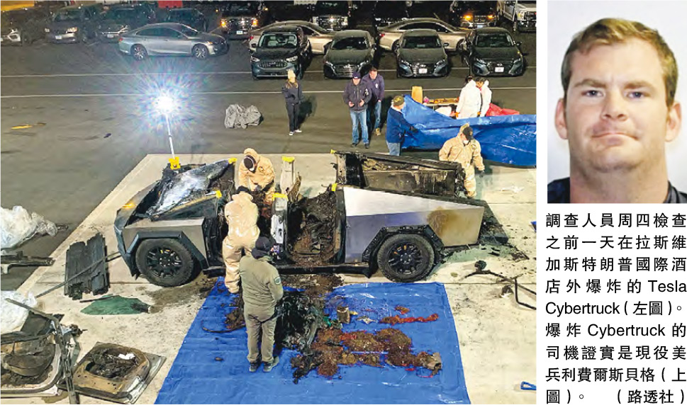 【明報專訊】一輛Tesla Cybertruck電動農夫車周三(1日)在美國拉斯維加斯的特朗普國際酒店外爆炸,司機當場喪命,7人輕傷。當局周四證實司機為現役特種部隊成員,在爆炸發生前頭部已經中彈,相信是吞槍自殺。
