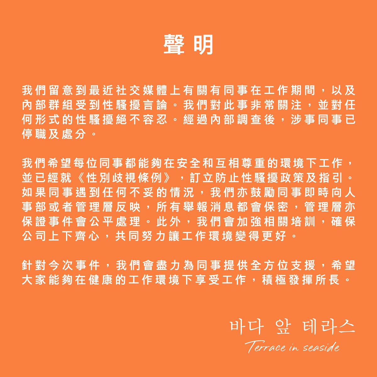事隔一日,Terrace in seaside今午在社交平台發聲明,稱留意到有同事在工作期間,以及內部群組受到性騷擾言論,對事件表示關注,經內部調查後,涉事同事已停職及處分。