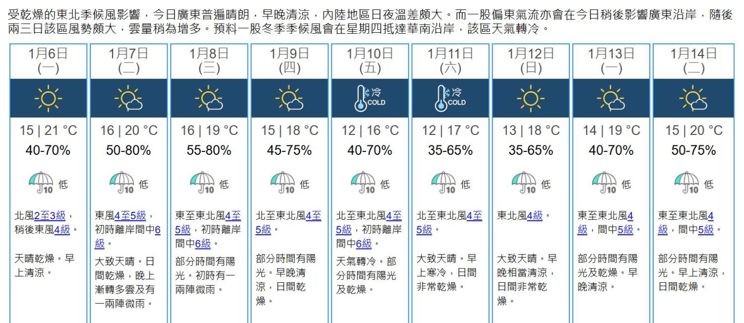 展望未來兩三日早上仍然清涼,風勢頗大,雲量逐漸增多及有微雨。周四(9日)氣溫開始下降,周五(10日)及周六(11日)早上氣溫約在12°C左右。(天文台)