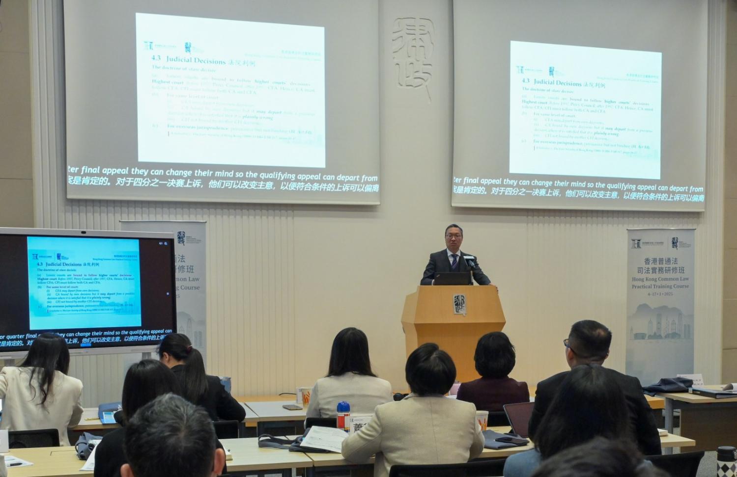 研修班是培訓學院2024年11月啟動後首個舉辦的課程,昨日的首場講座由律政司長林定國主講,介紹本港的普通法制度,包括普通法的應用、與內地法律制度的比較、如何在普通法制度下解決事實問題及法律問題,以及如何確保普通法系統的運作。