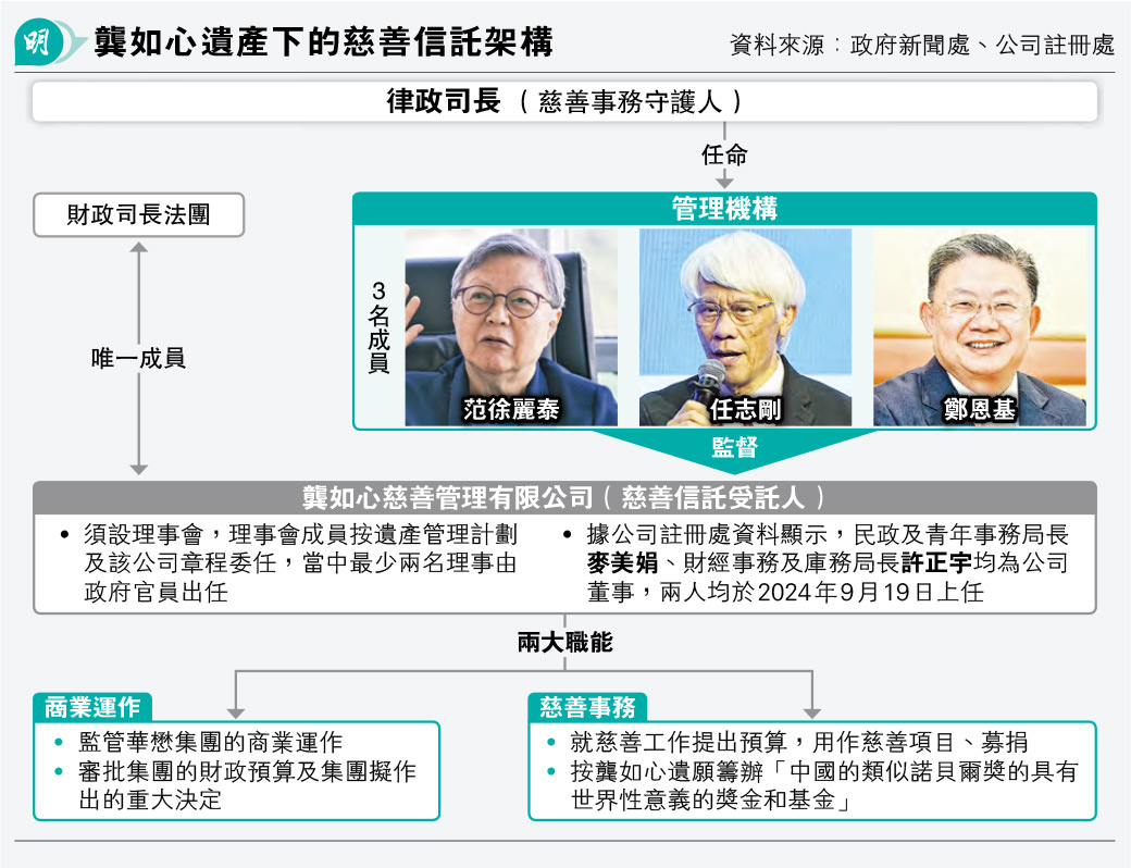 【明報專訊】已故華懋集團主席龔如心留下逾千億元遺產,其遺產管理終有定案。律政司昨發聲明稱,高院原訟法庭委任「龔如心慈善管理有限公司」為龔如心遺產下慈善信託的受託人,律政司長任命范徐麗泰、任志剛及鄭恩基出任負責監督受託人運作的管理機構成員。聲明表示,受託人主要職責包括華懋集團商業運作及慈善事務工作,受託人須設理事會,最少兩名理事須由政府官員出任。本報翻查公司註冊處資料,受託人現任兩名董事,分別為民政事務及青年局長麥美娟和財經事務及庫務局長許正宇,兩人於去年9月上任。