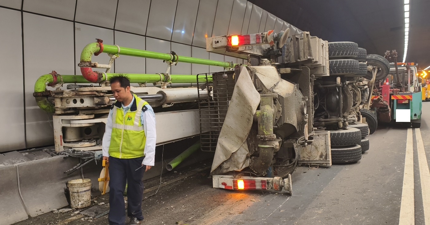 綜合現場及網上片段見到,涉事重型貨車當時疑拖著特別用途車在隧道左線行駛,特別用途車意外後向左翻側,隧道左邊的飾板損毀嚴重,警員在場拍照記錄。
