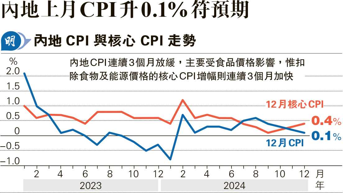 【明報專訊】國家統計局公布,內地12月居民消費價格(CPI)按年上升0.1%,符合市場預期,增幅雖較11月放緩0.1個百分點至3月以來最低,不過按月變幅扭轉過去兩個月下跌至持平,撇除波幅較大的食品和能源的核心CPI按年升0.4%,較11月加快0.1百分點,升幅更已連續3個月加快(見圖)。12月工業生產者出廠價格指數(PPI)按年下跌2.3%,小於市場預期的跌2.45%,惟按月變幅轉跌0.1%。