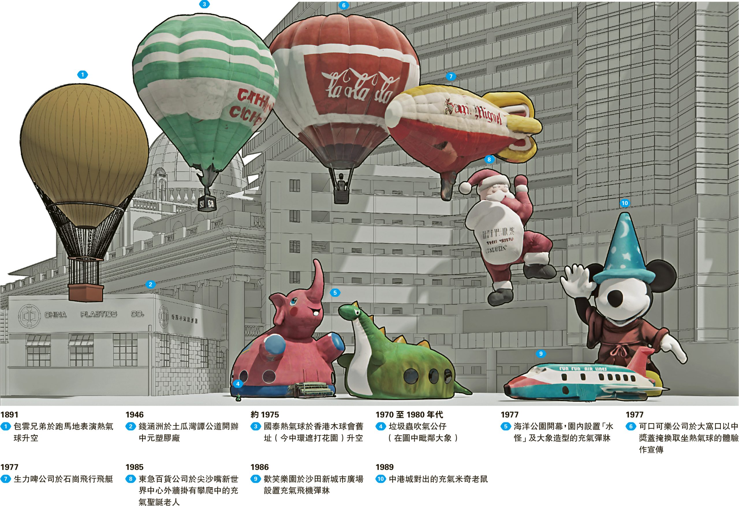 1946年,香港首家塑膠廠「中元塑膠廠」在土瓜灣成立,標誌着本地塑膠工業的起步(註2)。到了1950年代,香港塑膠工業蓬勃發展,有廠家開始入口PVC塑料薄膜生產水泡、吹氣梳化,吹氣玩具如吹氣公仔成為兒童的重要娛樂選擇(註3),在電子遊戲尚未普及的年代,這些充氣玩具成為本地標誌性娛樂產品,也為充氣結構在香港的應用提供了材料與技術基礎。