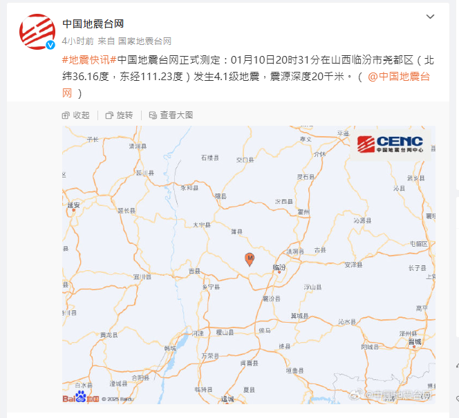 即時兩岸 山西臨汾發生4.1級地震 民眾室外暫避 (00:46) 發佈於 10 個月 前 2025 年 1 月 11 日 By 明報 中國地震台網測定,山西臨汾市堯都區1月10日晚上8時31分發生4.1級地震,震源深度20公里。 由於正值西藏定日地震發生不久,臨汾地震引起眾多關注,當地民眾也紛紛在網上表示感到明顯震感,居民落樓在住宅小區內停留,暫時不敢回家;在學校住宿的學生都跑到操場躲避。 當地目前晚上氣溫最低-1℃。(綜合報道) 相關文章:地震定日山西編輯推介臨汾 Up Next 再有「航天系」落馬 湖南航天原書記焦繼革受查 (00:58) 不要錯過 體育總局排球運管中心原主任李全強被查 (17:09) 繼續閱讀 贊助商 猜你喜歡 【東京】鏡頭下的震災重生敘事 雲南普洱市景谷縣發生3.6級地震 (16:25) 雲南普洱市景谷縣發生3.2級地震 (16:43) 菲6.9級地震最少69死 菲律賓宿霧省6.9級地震釀最少60死 逾600次餘震【短片】 (12:16) 甘肅5.6級地震最少7人傷 居民︰在牀上被搖醒 (13:32)