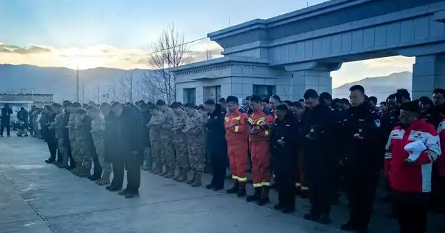 西藏定日6.8級地震悼念儀式今早(13日)9時30分在日喀則市定日縣、拉孜縣、定結縣等多地舉行,其中受災最嚴重的長所鄉,參與救援的解放軍和武警官兵、消防救援人員、公安民警、醫護人員、青年志願者及有關企業員工、幹部職工、震區民眾代表數百人,脫帽肅立,防空警報響起,向遇難者默哀3分鐘。