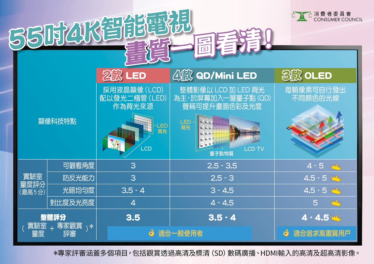 消委會測試的9款55吋4K智能電視,涵蓋3類顯像科技 ,有3款為OLED樣本、4款QD/Mini LED、2款為LED,售價介乎3890元至21980元。功能測試及評審由國際消費者研究及試驗組織(ICRT)統籌,並委託歐洲的檢定中心進行,本港機電工程署則委託獨立實驗室進行能源效益及產品安全測試,全部樣本均通過相關安全測試。