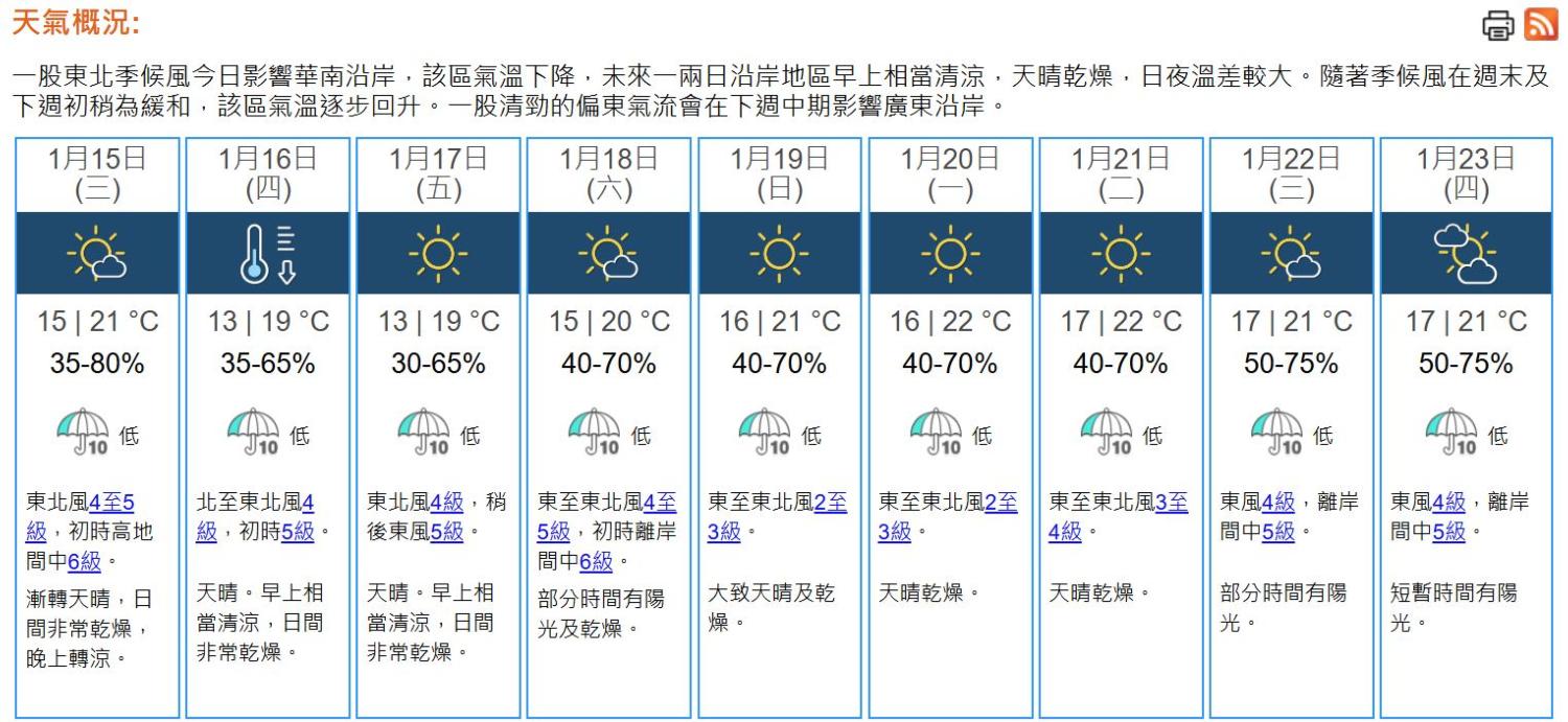 即時熱點 天氣|天文台:日間最高21°C 晚上轉涼 (08:55) 發佈於 11 個月 前 2025 年 1 月 15 日 By 明報 上午8時40分,天文台錄得氣溫18.7°C,相對濕度47%。 東北季候風正影響廣東。此外,覆蓋沿岸地區的雲帶正逐漸轉薄。本港地區今日(15日)天氣預測漸轉天晴,日間非常乾燥,最高氣溫約21°C,晚上轉涼。吹和緩至清勁東北風,初時高地間中吹強風。 展望未來一兩日天晴,日間非常乾燥,市區最低氣溫在13°C左右,新界再低幾度。周末期間早上仍然清涼。(天文台) 相關文章:天文台天氣天氣速遞編輯推介 Up Next 天氣|天文台:周四13°C-19°C 新界再低幾度及寒冷 (21:02) 不要錯過 圖看印度大壺節集體沐浴 (09:02) 繼續閱讀 贊助商 猜你喜歡 天氣|天文台:日間部分時間有陽光 最高22°C (08:32) 天氣|今日天晴乾燥 市區最高氣溫料25°C 聖誕節料早晚清涼 (09:12) 天氣|平安夜料溫暖 聖誕節市區氣溫最低15°C Boxing Day 14°C (20:15) 天氣|天文台:日間乾燥及溫暖 最高25°C (09:46) 天氣|天文台:日間部分時間有陽光 最高23°C (08:46) 天氣|天文台:日間乾燥 晚上漸轉多雲 (08:20)