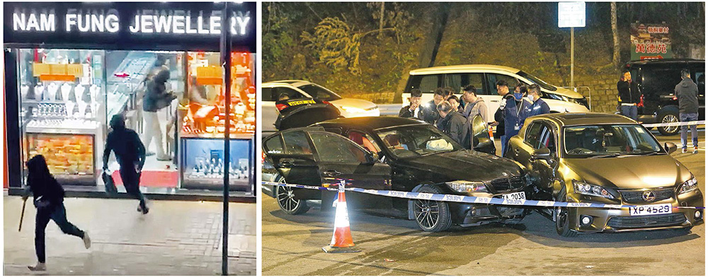 港聞 4匪劫金舖 登寶馬逃離撞車 發佈於 1 年 前 2025 年 1 月 16 日 By 明報 【明報專訊】上水發生劫案。警方昨晚6時許接報,4名黑衣蒙面人持刀槌打劫新豐路一間金舖,據報4人得手後登上私家車,向沙頭角方向逃去。金舖飾櫃遭砸毁,玻璃碎片散落一地。網傳片段見到4人身穿全黑裝束,有人拿長柄槌,有人將金器放入袋。約半小時後,涉案寶馬疑在林錦公路近梧桐寨迴旋處撞到另一私家車(右圖),寶馬司機及乘客落車逃走。據悉有途人見到其中3名非華裔疑犯逃向嘉道理農場方向。現場所見寶馬安全氣袋彈出,警員在車內蒐證,以無人機拍攝環境。 相關文章: Up Next 合併航線日日駛 水上的士去年11萬客 不要錯過 九龍灣酒樓57人中毒 食安指示停供燒味 繼續閱讀 贊助商 猜你喜歡