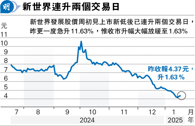 【明報專訊】新世界發展(0017)股價自去年12月27日起,跨年跌至本周二(即1月14日),連跌12個交易日並尋底,累計下跌22.31%後,至近日終見反彈並連升兩日。該股繼周三股價上升2.87%後,昨日儘管升幅收窄至1.63%,收報4.37元,但是累計兩日升幅仍達4.55%。相比周三只錄得6072萬元成交,世界昨日成交額進一步增加至1.41億元,好友趁市况好轉「挾淡倉」意味甚濃。