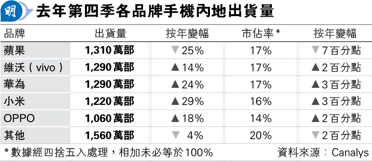去年第四季,雖然蘋果以1310萬部出貨量位居首位(見表),但按年下跌25%,市佔率亦降至17%;vivo和華為均佔17%市場份額,分別排名第二及第三。小米(1810)出貨量達1220萬部,按年增長29%,成為增長最快的品牌,並連續4個季度實現市場份額增長。整體而言,第四季內地智能手機出貨量按年增5%至7740萬部。
