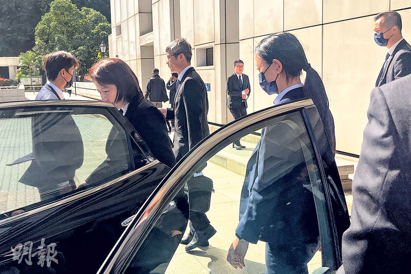 壹傳媒違契上訴案,3名上訴庭法官昨日(15日)押後頒布書面裁決;代表答辯方的刑事檢控專員楊美琪(左二)及其團隊昨散庭後,獲至少7名身穿西裝的保安人員護送登上私家車離開。就該些西裝人員是否警務人員、隸屬部門、以及其工作範圍是否包括要保護指定人士等,警方今日(16日)晚上回覆本報查詢稱,警方會因應不同行動的風險評估而作出相應部署,暫無其他資料提供。