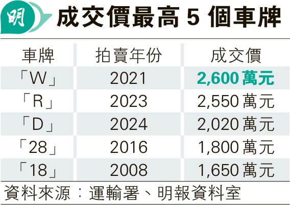 翻查資料,歷來拍賣成交價最貴車牌是「W」,在2021年3月7日新春車牌拍賣會以2600萬元成交;第二位是2023年2月拍賣的自訂車牌「R」,買家以2550萬元投得;至於第三位則是去年2月拍賣的「D」車牌,以2020萬元成交(見表)。