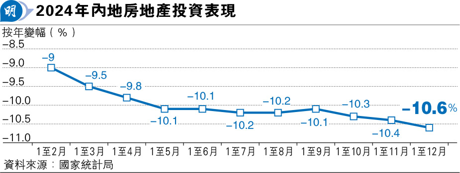 【明報專訊】國家統計局公布,去年全國房地產開發投資近10.03萬億元(人民幣,下同),按年跌10.6%(見圖),創1987年有紀錄以來最大跌幅,跌幅較首11個月擴大0.2個百分點;其中住宅投資約7.6億元,按年跌幅亦達10.5%。內地去年全年新建商品房銷售面積為9.74億平方米,按年跌12.9%,其中住宅銷售面積跌14.1%;新建商品房銷售額96750億元,按年跌17.1%,其中住宅銷售額跌17.6%。