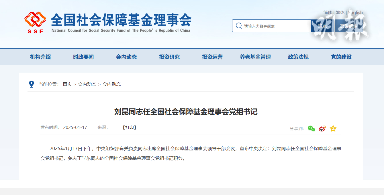 全國社會保障基金理事會官網1月17日通報,當天下午,中共中央組織部有關負責人出席全國社會保障基金理事會領導幹部會議,宣布中央決定:劉昆任全國社會保障基金理事會黨組書記,免去丁學東的全國社會保障基金理事會黨組書記職務。