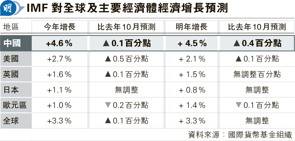 【明報專訊】國際貨幣基金組織(IMF)上周五更新世界經濟展望,中國內地今年經濟增長預測較去年10月報告調高0.1個百分點至4.6%,明年經濟增長預測則獲上調0.1個百分點至4.5%,反映財政措施帶來額外增長動力。不過IMF首席經濟學家古蘭沙(Pierre-Olivier Gourinchas)表示,一旦內地財政和貨幣政策不足以解決國內經濟問題,將有陷入債務型通縮風險,物價下跌令負債的實際價值推高,進一步收縮經濟活動。