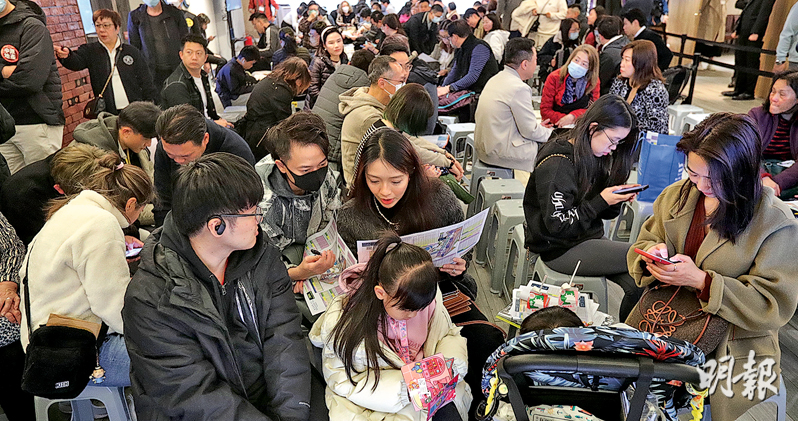 樓花期長約11個月的屯門黃金海灣.珀岸,開售前共錄逾4500票登記,超額認購逾15倍。昨日銷售分3組進行揀樓,分別S組(員工組別)、A組及B組,其中S組先到先得形式發售,而A及B組以抽籤形式發售。A及B組的買家人數眾多,買家需要排隊等候入場,人龍由銷售處尖沙嘴半島中心2樓排至地下,場面熱鬧。
