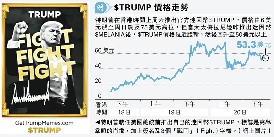 【明報專訊】特朗普準備對加密貨幣行業鬆綁,刺激加密貨幣近期被熱炒。就在特朗普宣誓就任美國總統前,他與太太梅拉尼婭(Melania Trump)相繼推出官方迷因幣(memecoins),令夫婦帳面身家暴漲逾百億美元。外界質疑特朗普可能從其即將推出的加密貨幣政策獲利,引發利益衝突及道德爭議。比特幣價格昨亦升穿10.9萬美元,刷新歷史高位。