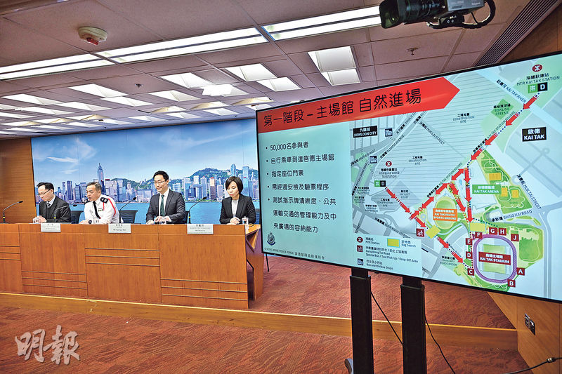 明日演練將分3階段在主場館、體藝館及青年運動場舉行(見表)。所有參加者將於傍晚6時起陸續入場,待晚上9時許始離開,其間主場館會上演各紀律部隊樂隊的聯合演出,體藝館則會舉行緊急疏散演習。跨部門演練小組執行長、警務處副處長(行動)周一鳴回應目標疏散時間稱,「希望安全有序及愈快愈好」;他指今次演練仿照一般演唱會做法,參加者離場時將按自身需要往不同方向散去,盼汲取經驗,待體育園揭幕後作更好安排。