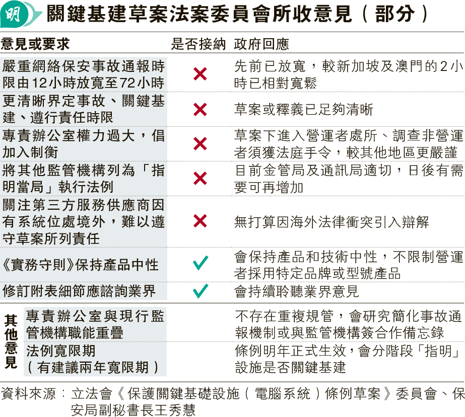 【明報專訊】保安局正推動立法規管「關鍵基礎設施」營運者保護電腦系統。草案委員會早前邀請公眾提出意見,至今接獲18份意見書,其中一份在本周二限期後提交。局方認為,意見書「普遍支持」法例規管框架,所提意見相對較技術性。本報翻查相關文件,大部分建議及要求均未獲局方採納。有意見書及議員分別認為,政府應確保或列明《條例草案》不會侵犯個人私隱及公司機密。保安局副秘書長王秀慧昨稱,當局不會針對公司系統內的個人資料和商業秘密,但條例不會列明相關原則。