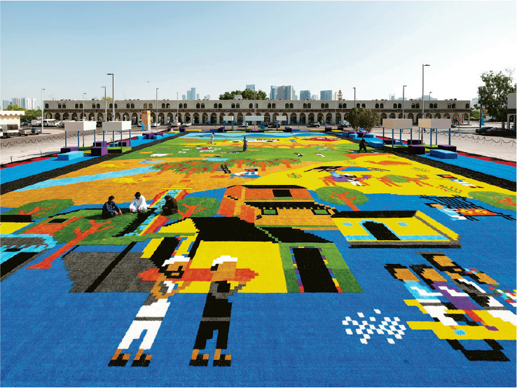 那麼藝術作品與大眾的權力關係又是什麼?公共藝術是政治的延伸,以之建構集體回憶,凝聚市民的歸屬感。選址也必定選在與大眾生活相關的地方,少不免干預到居民的生活。在阿布扎比的地氈市集中,藝術家Christopher Joshua Benton放置了作品Where Lies My Carpet Is Thy Home(2024)。藝術家在地氈市集的中庭戶外空間做了一幅巨型的地氈,圖案與他在阿富汗、巴基斯坦及印度等地的個人回憶有關。雙年展的開幕晚宴在此作的所在地(即地氈市集)舉行。原本凋零、周遭被各個工程地盤圍繞着的地氈市集,氣氛瞬間被藝術炒熱了。旁邊的商家紛紛出來圍觀。當天的飯局是開放式的,店家沒有獲邀,也沒有被拒。而他們就只是默默地站在場外看着我們一堆藝術人不知在喜慶什麼。情景就像是大眾與藝術總是有着無形的界線,若跨越了,會不會更顯尷尬?
