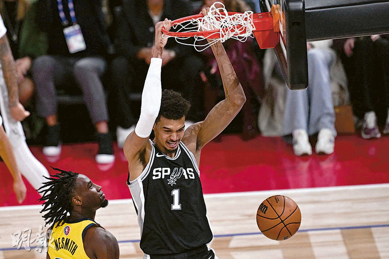 【明報專訊】聖安東尼奧馬刺昨於移師法國巴黎上演的NBA常規賽,憑「主場」出戰的21歲法國籍中鋒雲班耶馬貢獻「雙雙」的30分及11個籃板,以140:110大勝印第安那溜馬,兩隊明晨將再次會戰巴黎。