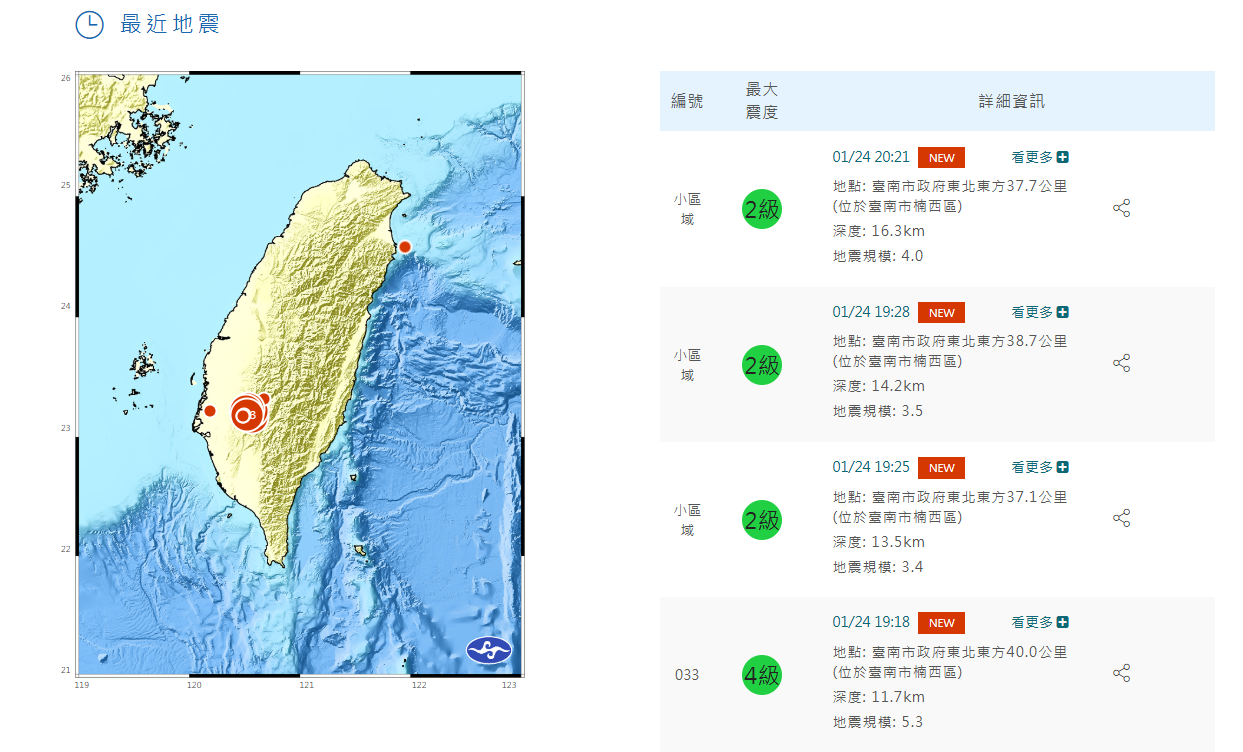 即時兩岸 台南5.3級淺層地震 (20:58) 發佈於 9 個月 前 2025 年 1 月 24 日 By 明報 台灣中央氣象署消息,台南市1月24日晚上7時18分發生規模5.3地震,震源深度11.7公里,震央位於台南市政府東北東方40.0公里(位於台南市楠西區)。 台灣高鐵公司公告,因南部地區地震需執行路線檢查,導致部分列車延誤,造成不便敬請見諒。 近日台南已連續發生多次4級以上地震,引起當地民眾關注,暫時沒有傷亡報告。(綜合報道) 相關文章:台南地震編輯推介 Up Next 隱形的火車站 雲南諸葛城站(多圖) (02:52) 不要錯過 中國發射千帆極軌06組衛星 「千帆星座」進入組網階段 (16:45) 繼續閱讀 贊助商 猜你喜歡 【東京】鏡頭下的震災重生敘事 雲南普洱市景谷縣發生3.6級地震 (16:25) 雲南普洱市景谷縣發生3.2級地震 (16:43) 菲6.9級地震最少69死 菲律賓宿霧省6.9級地震釀最少60死 逾600次餘震【短片】 (12:16) 甘肅5.6級地震最少7人傷 居民︰在牀上被搖醒 (13:32)