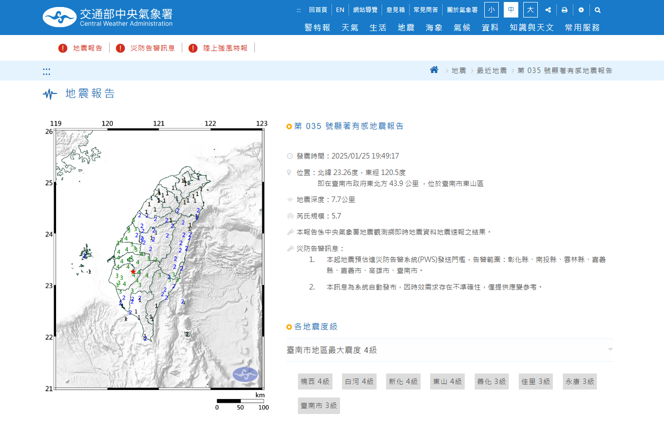 即時兩岸 台南東山規模5.7地震 震源深度僅7.7公里 (20:45) 發佈於 9 個月 前 2025 年 1 月 25 日 By 明報 台灣中央氣象署最新通報,台南市1月25日晚上7時49分發生規模5.7地震,震源深度僅7.7公里,屬於極淺層地震,震央位於台南市政府東北方43.9公里(位於台南市東山區),最大震度台南市、嘉義縣、高雄市、嘉義市、雲林縣、彰化縣4級,整個南台灣震感強烈。 暫時官方沒有通報傷亡及損毀報告。 大陸地震台網則測定台南市發生5.1級地震,震源深度11公里。(中央社、新華社) 相關文章:5.7地震台南地震淺層編輯推介 Up Next 海南商業航天發射場新建兩個發射工位 (03:44) 不要錯過 大操大辦喪事、迷信、受賄 海南前書記羅保銘被開除黨籍 (17:09) 繼續閱讀 贊助商 猜你喜歡 阿富汗北部地震 最少20死500傷 【東京】鏡頭下的震災重生敘事 雲南普洱市景谷縣發生3.6級地震 (16:25) 雲南普洱市景谷縣發生3.2級地震 (16:43) 菲6.9級地震最少69死 菲律賓宿霧省6.9級地震釀最少60死 逾600次餘震【短片】 (12:16)