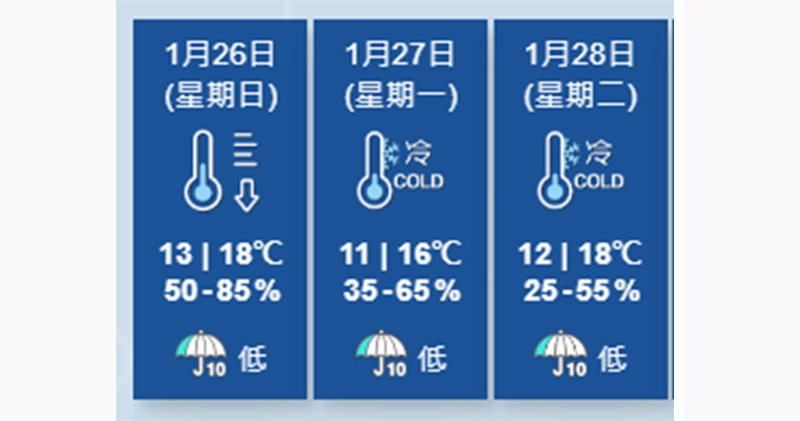 即時熱點 天文台發出寒冷天氣警告 (11:10) 發佈於 10 個月 前 2025 年 1 月 26 日 By 明報 天文台上午11時發出寒冷天氣警告。天文台預測本港未來一兩日早上天氣寒冷。明早市區最低氣溫約11°C,新界部分地區及高地嚴寒。市民應注意保暖,多穿禦寒衣物,並應保持室內空氣流通。由於高地風勢頗大,風寒效應明顯,身體感覺的溫度比實際氣溫要低,長時間在寒風中有機會導致體溫過低。 相關文章:天文台天氣天氣速遞寒冷編輯推介 Up Next 北海道「層雲峽溫泉冰瀑節」開幕 原木框澆水天然凍結成冰雕【附參觀資料】 (16:08) 不要錯過 年花知多啲:桃花寓意「大展鴻圖」 牡丹象徵繁榮 (15:46) 繼續閱讀 贊助商 猜你喜歡 天氣|天文台:今日乾燥部分時間有陽光 市區最高氣溫27°C (09:09) 天氣|天文台:日間最高28°C 吹和緩北至東北風 (09:31) 天氣|天文台:周日多雲日間乾燥 氣溫24至30°C (20:01) 短片:樺加沙一個月後 重災區將軍澳海濱未復常、富麗敦海洋公園酒店大門復修中 (08:59) 天文台:今日沿岸水位高0.5至1米 晚上漲潮部分沿岸低窪地區或輕微水浸 (08:35) 天氣|天文台:本港今早普遍18°C 未來兩三日氣溫回升 (08:23)