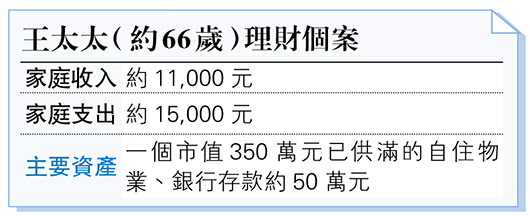 首先,根據王太太所提供的資訊所示,現時有入不敷支的情况,每個月的缺口約4000元,可能由於仍然有銀行存款50萬元,假設其他情况不變下,仍然有機會「慢慢搣」近10年,所以不排除因此而心大心細,以致不急於申請安老按揭,但值得一提的是現時「長命百歲」也不奇怪,如果已知存款是不夠用的,宜及早準備。