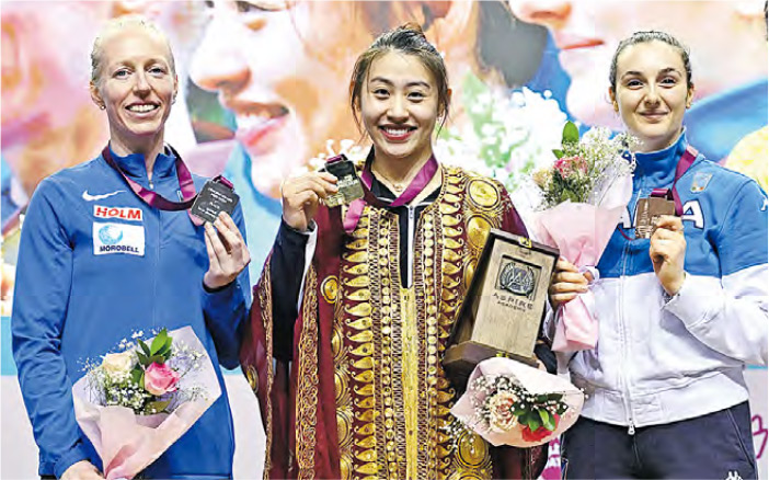 【明報專訊】重劍大獎賽多哈站昨煞科,23歲港將佘繕妡在女子個人賽過關斬將,於決賽以15:7擊敗愛沙尼亞隊星將迪菲特(Nelli Differt),成為繼江旻憓及張家朗之後,港隊史上第3人在大獎賽奪金。