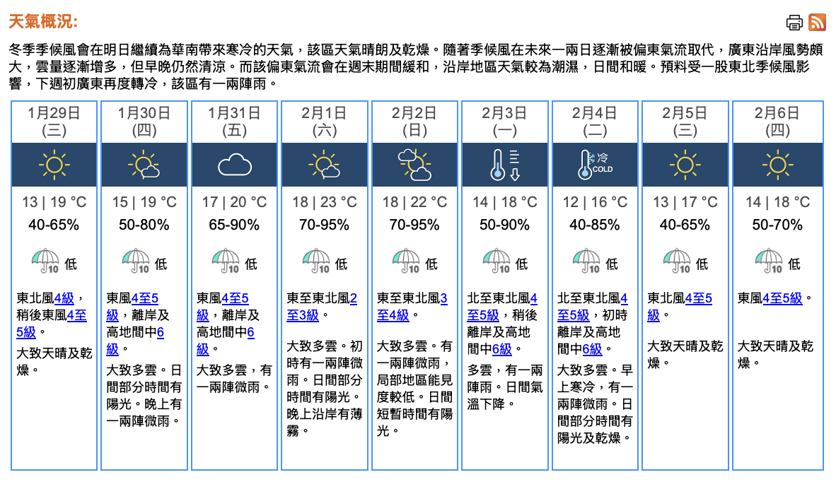 即時熱點 天氣|天文台:年初一天晴乾燥 市區最低13℃ (21:31) 發佈於 1 年 前 2025 年 1 月 28 日 By 明報 天文台表示,冬季季候風會在明日(1月29日)繼續為華南帶來寒冷的天氣,該區天氣晴朗及乾燥。本港地區明日預測大致天晴及乾燥。明早市區最低氣溫約13℃,新界再低幾度及寒冷。日間最高氣溫約19℃。吹和緩東北風,明日稍後轉吹和緩至清勁東風。 展望年初二(1月30日)東風增強,雲量逐漸增多,晚上及年初三(1月31日)有一兩陣微雨。週末期間天氣較為潮濕,日間和暖。下周一(2月3日)氣溫再度下降。 相關文章:天文台天氣天氣速遞編輯推介 Up Next DeepSeek|95後關鍵開發者「天才少女」羅福莉爆紅 羅福莉是誰? (20:14) 不要錯過 天氣|天文台:本港今早大部分地區降至11°C左右 非常乾燥 (08:24) 繼續閱讀 贊助商 猜你喜歡 天氣|天文台:周四多雲早晚有微雨 氣溫介乎17至20°C (20:57) 天氣|天文台:今早多區氣溫較昨日低1至2°C 日間最高21°C (08:24) 天氣|天文台:周三有一兩陣微雨 早上清涼市區最低17°C (21:01) 天氣|天文台:今日部分時間有陽光 市區最高氣溫料21°C。 (08:55) 天氣|天文台:周一有幾陣雨 市區17°C-20°C 相對濕度可高達90% (19:41) 天氣|天文台:日間乾燥最高19°C 明日風勢較大 (09:41)
